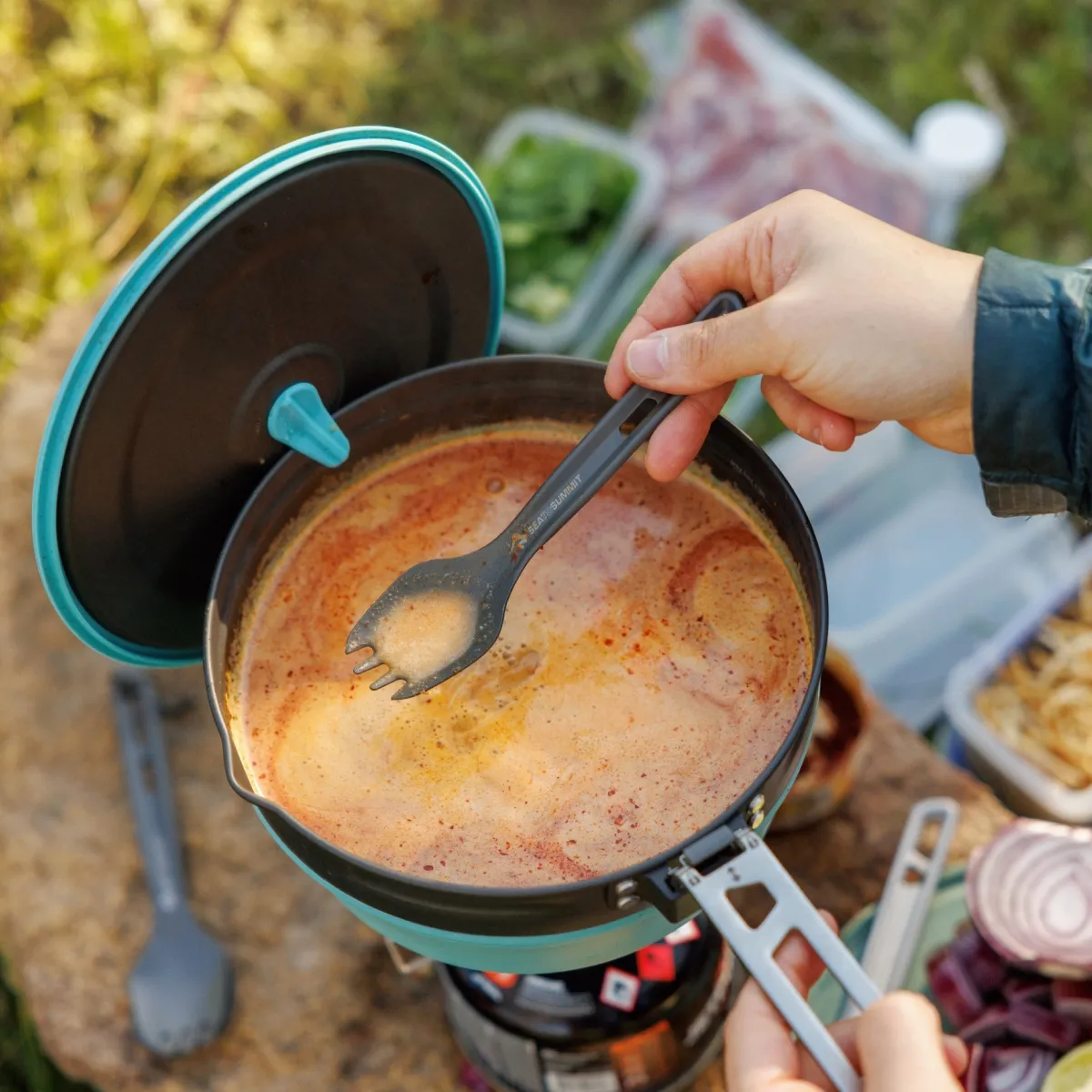 El tenedor-cuchara Frontier cuenta con un mango con un perfil único que le otorga mayor resistencia y permite apilarlo junto con otros utensilios Frontier. El recipiente y los dientes tienen un acabado semipulido para disfrutar más de la comida. Fabricado en aluminio anodizado duro de calidad aeronáutica, el tenedor-cuchara puede ser el único utensilio que necesite en viajes rápidos y ligeros.