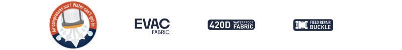 - Base Evac CORDURA® 500D: permite expulsar el aire sin dejar entrar agua, para una compresión natural y un perfil más compacto.