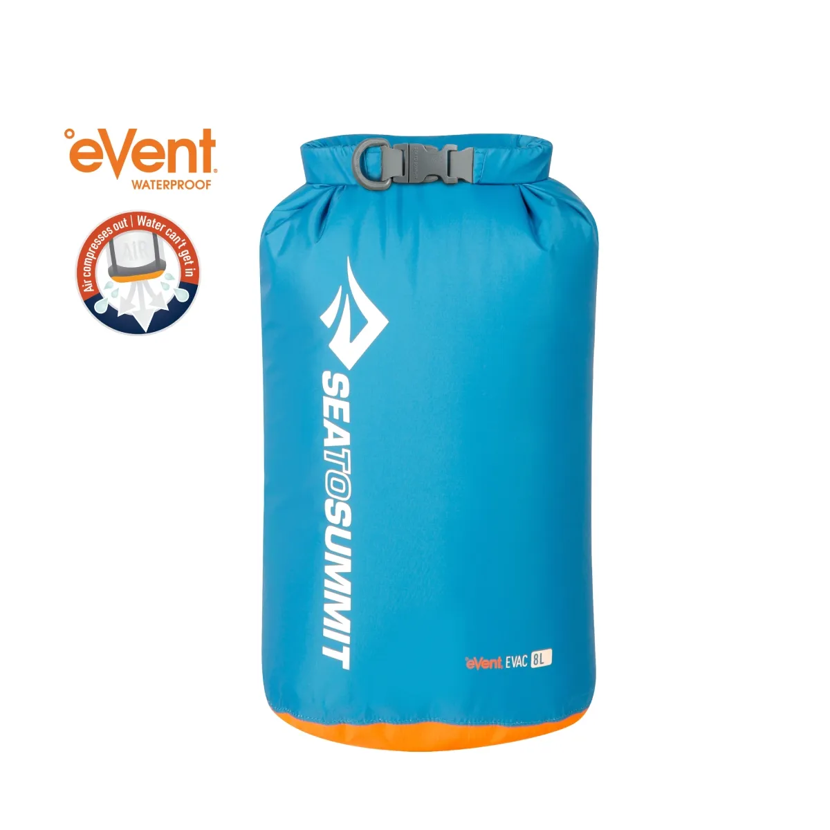 El eVac Dry Sack utiliza tejido de nailon ligero 70D para mayor resistencia y tejido impermeable eVent® permeable al aire en la base. El tejido eVent te permite exprimir el aire del saco seco para una utilización más eficiente del espacio dentro de una mochila. Empaque sus artículos comprimibles (sacos de dormir, ropa aislante) en el saco seco eVac, enrolle el cierre superior enrollable hacia abajo y luego apriete el saco para expulsar el aire. Esta función le permite colocar artículos en su mochila o bolsa de viaje de manera más efectiva. Tienen forma ovalada, lo que los hace perfectos para deslizarse en los contornos de tu mochila, además todas las costuras tienen doble costura y sellado con cinta.